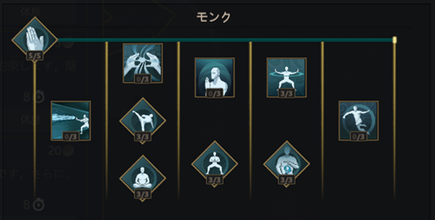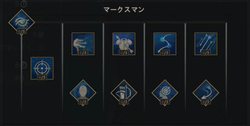 | 3 | ミディアムアーマーエキスパート | すべての中装防具の重量負担を10/20/30%減少させる。 | パッシブ | Lv 6 筋力 7 耐久 8 |