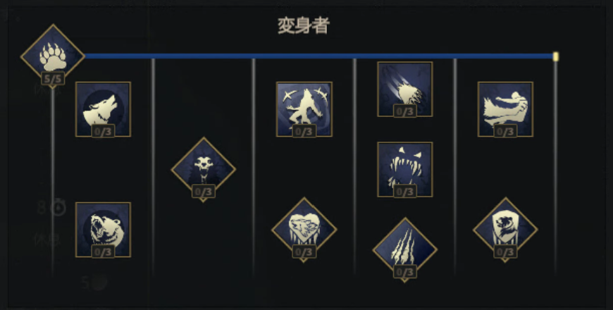 | 1 | ウェアウルフフォーム | 狂暴なウェアウルフに変身する。 敏捷が2/4/6上昇し、移動速度が50%増加し、最大SPが25/50/75上昇する。 変身中、基本武器ダメージが2015(?)になり、すべての装備属性と特殊効果を引き継ぐ。 変身系以外のほとんどのアクティブスキルが使用できなくなり、 武器に依存するパッシブスキルも一時的に無効となる。 |