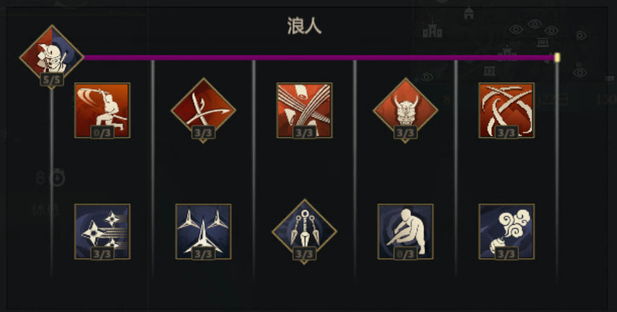 - 浪人: 基礎、矢斬り、苦無打ち、強横