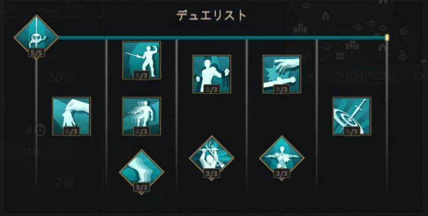 | 基礎 | デュエリスト | 1対1の戦闘中、命中と回避が3/6/9/12/15増加する。 | |||