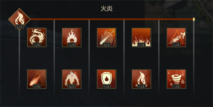 | 基礎 | フレイムアフィニティ | 火炎ダメージボーナス +3/6/9/12/15% 火炎耐性 +3/6/9/12/15% |