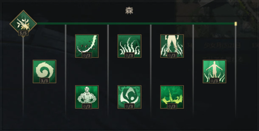 | 基礎 | フォレストアフィニティ | 刺突ダメージボーナス +3/6/9/12/15% 刺突耐性 +3/6/9/12/15% |
