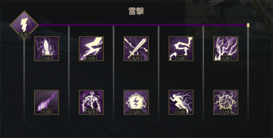 | 3 | チャージドウェポン | 15/20/25秒間、自分または味方の武器に雷電魔法を付与し、 攻撃に6/9/12の追加電撃ダメージを与え、攻撃速度を10/15/20%増加させる。 |