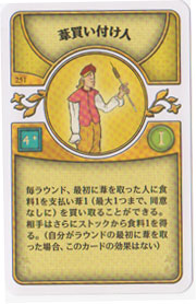 | 大将軍 | 4点 | 買付三兄弟の長男、三兄弟は何かの分野をソフトロックするスペシャリスト、長男の葦買付人は増築改築に関わるアクションに影響力を及ぼす、序盤の先行増築のゲット権含め、葦2のマスに誰も突っ込まなくなる影響力は異常。忘れがちだが終盤の改築戦線の葦にもちょっかいをだせる点も重要、とにかくかご製作所を買ってしまうと買いつけた葦が得点になったり食料になったり、目も当てられない。 |