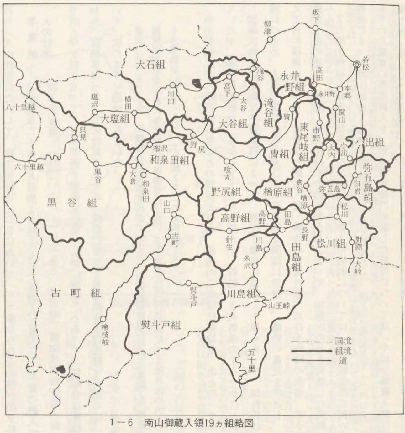 大沼郡と称す。中にも小出・弥五島・松川・楢原・田島・河島・高野・熨斗戸・古町・和田・黒谷・大塩組の地は郡名を失う。