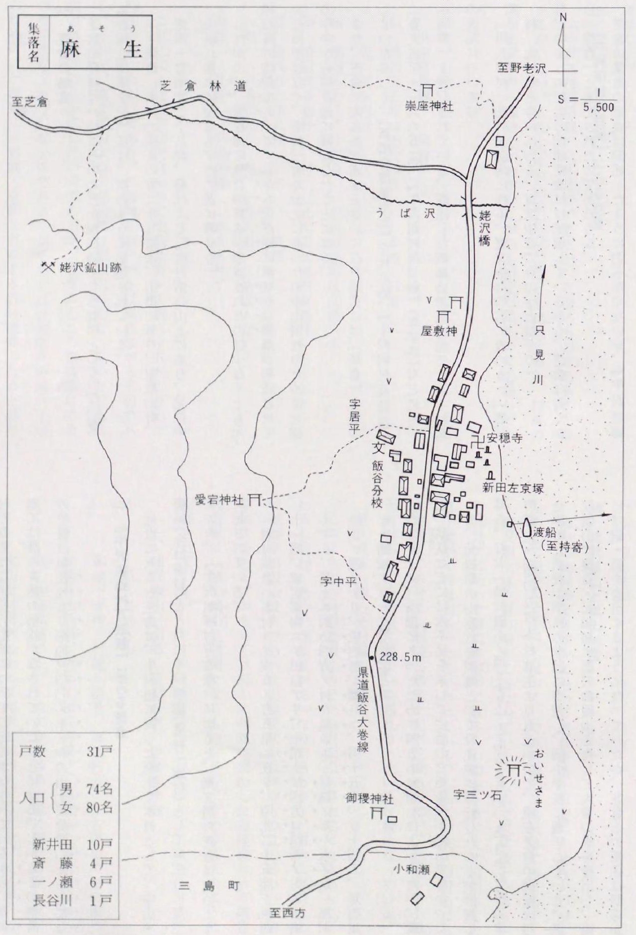 麻生集落の北に細い旧芝倉街道を、約1キロメートルほど急坂を登ると、その中腹に神社がある。木造鳥居は腐朽して倒れているが、広い境内の東側に銀座している宮で、もとは広い境内全域に、神社はたてられていたという。勧請神も月日も知る証拠がない。しかし社名を表す文字が多種多様である。この宮と、周辺にある石碑から拾い上げても4種類ある。惣座大権現・崇座神社・宗座神社・惣座神社の銘である。麻生にこれを調査する文書もなく、古老からのたしかな伝承もききとれなかった。しかし、この信者は麻生地区のみでなく、周辺の人々も参詣しているのは、奉納された幡の多いのによっても想像がつく。