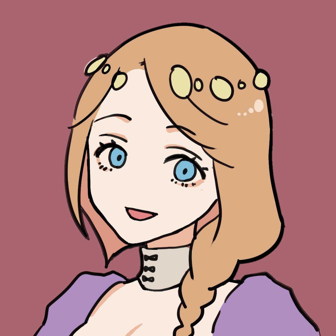 赤みを帯びた金髪を大きく編んで胸元に垂らしている。碧眼。
