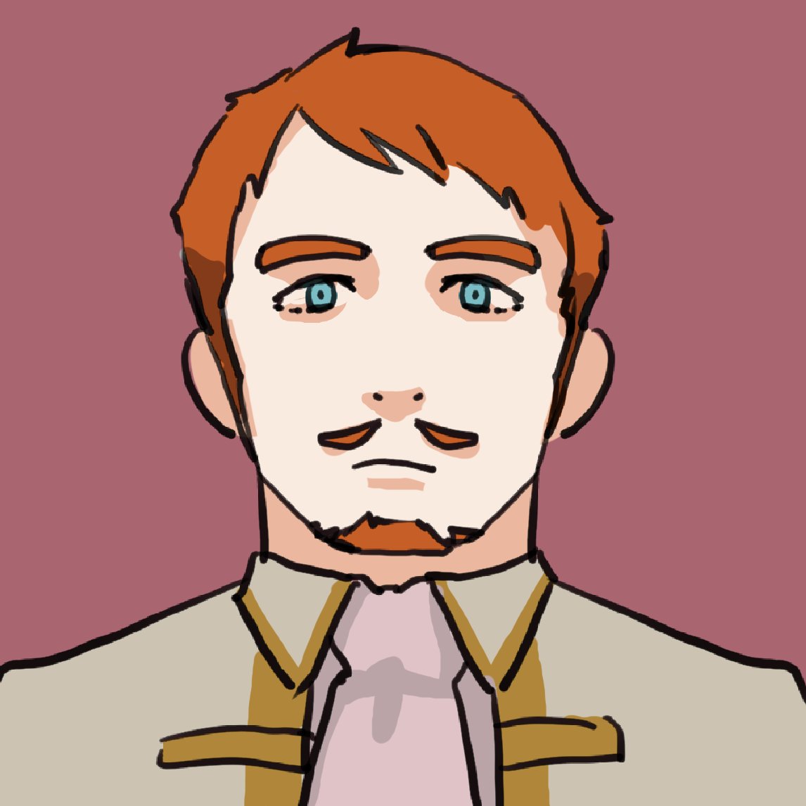 短く刈り込んだ赤毛、頬は剃り上げ鼻したと顎に髭。優しげな目元。