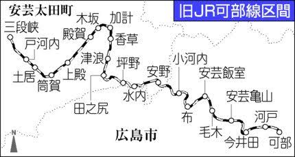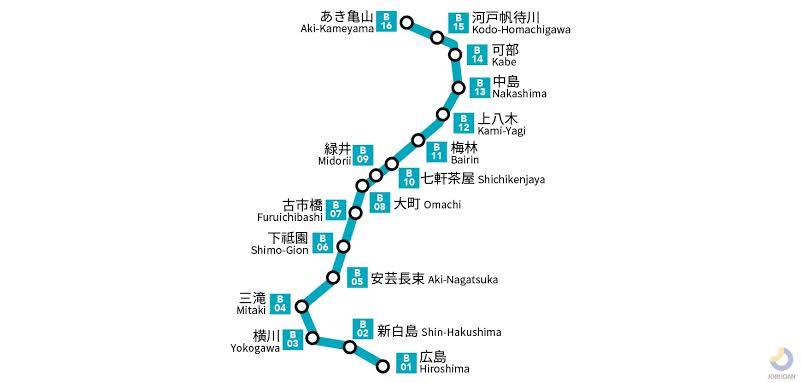 可部線は広島駅から可部駅を経由して三段峡駅に向う路線だった。現在は安芸亀山駅までで安芸亀山駅から三段峡駅間は廃止されている。広島駅から可部駅まで電化されていたが昔は可部駅から三段峡駅までは非電化で気動車で運行していた。現在は安芸亀山駅まで電化されている。現在の安芸亀山駅は今井田駅を吸収合併しており、今井田駅の駅名は残っていない。ちなみに建設時既にバス路線と競合していたため、駅数が多いのと比較的、駅間が短いのが特徴的。路線カラーはスカイブルーで路線記号はB。湖西線と同じ。