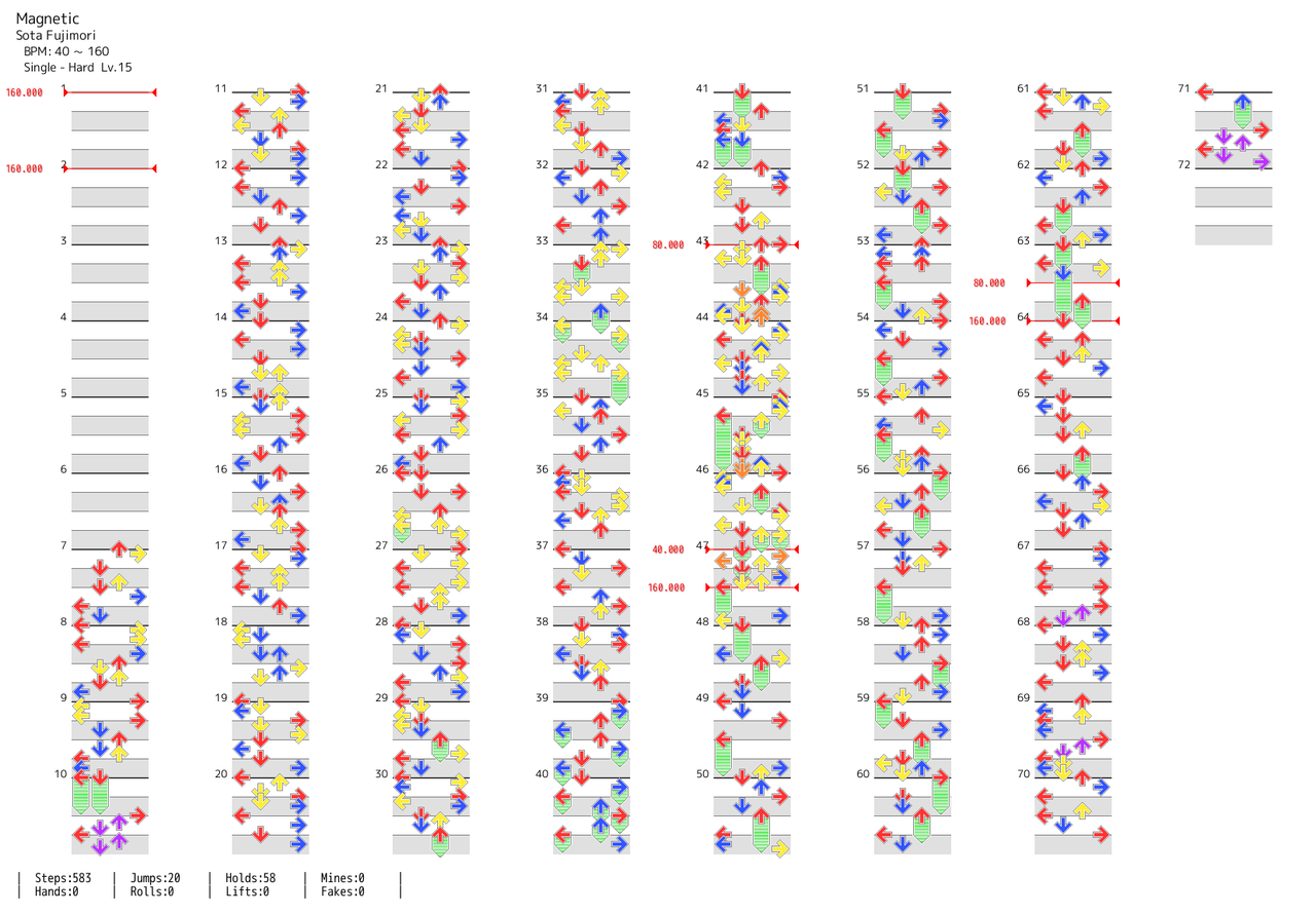 - 中盤でBPM80に急減速する箇所があるが、16分で↑→・↓と踏ませる箇所であるので容易に判断可能。