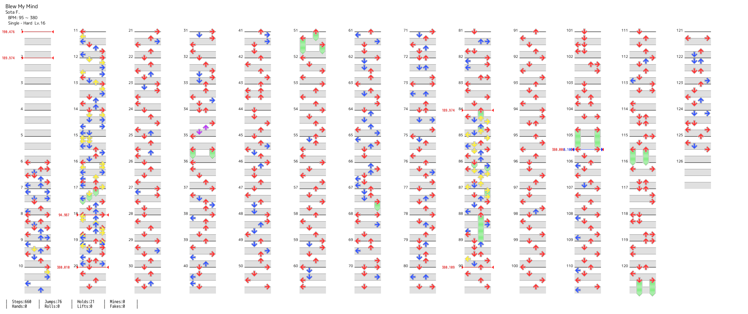 初見最初の低速で落ちた。リズム難なとこに矢印が詰まって流れてくるので必要な見切り力は足16の中でも上位だと思う。2回目の低速はまだ見切りやすいほうなのが救いだが、BPM380地帯である程度回復できる地力は必要 (2020-11-12 15:17:50)