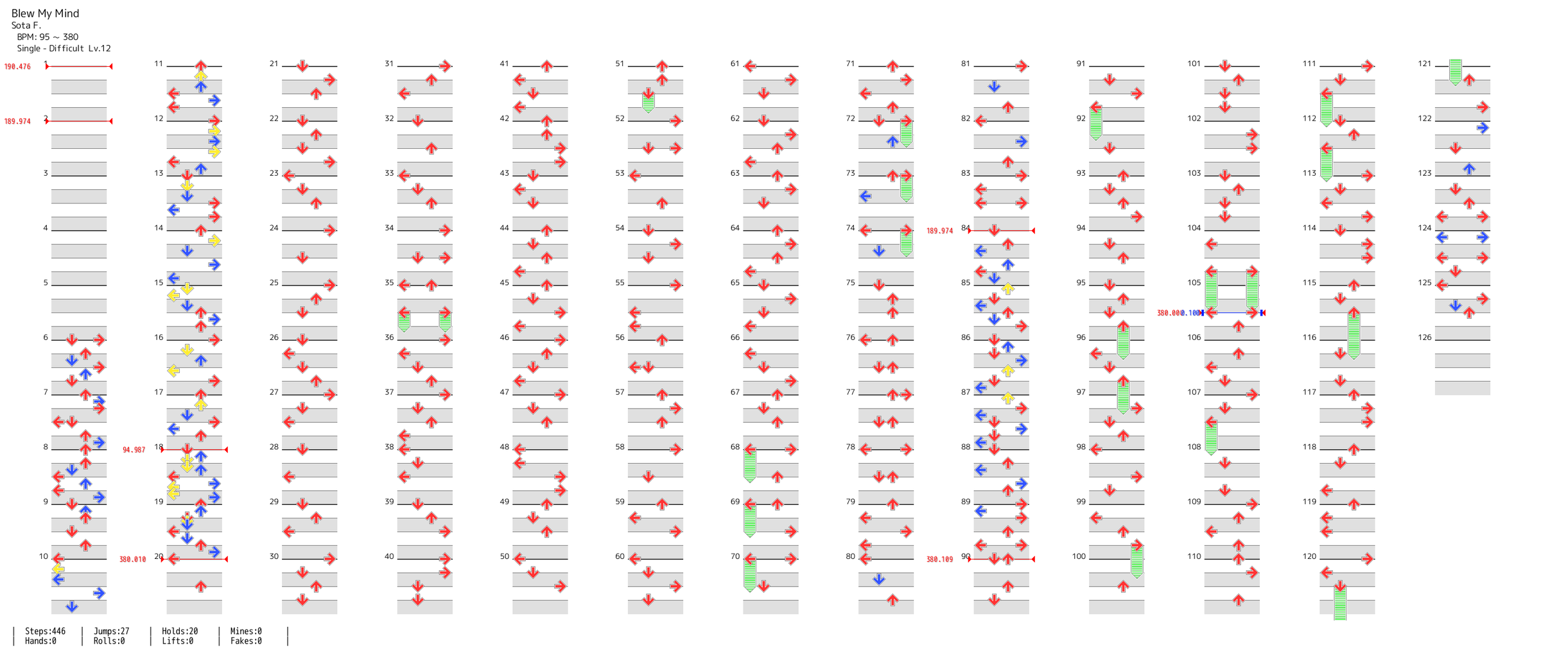 - 12としては速い縦連と捻りが厳しく交互踏みを目指すとスイッチや逆足も頻発してかなり難解。リズム難+ソフランによる見切りづらさも相まってVOL115だが足龍の課題曲としては向いていない。これに挑戦するレベル帯ならば踊プリンや激ロンドンAを詰めたほうが早いと思われる。