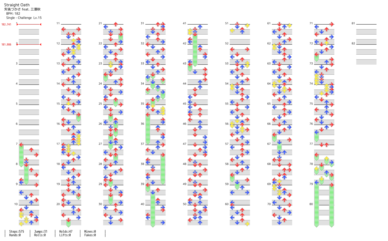 リズム難要素は皆無で、8分アフロ捻り&16分滝に足運びがついてこられるかだけがシンプルに問われる譜面。ただしBPM182で踏むため難度は高め。 (2015-05-11 23:48:58)