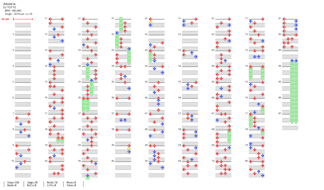 - 曲の長さの割に290ノーツしかなくスカスカな方であるが後半になるにつれ密度が上がる。一度だけ8分13連が出てくるが配置は単純なので問題ないだろう。