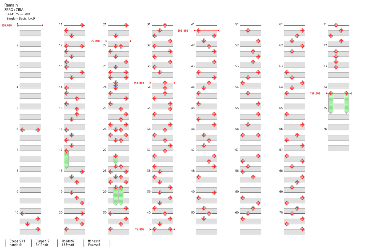 - 前半は低速でプレイしなければならないとはいえ足9とは思えないほど密度が低い。ノーツの半分近くがBPM300地帯にあるラス殺し譜面。