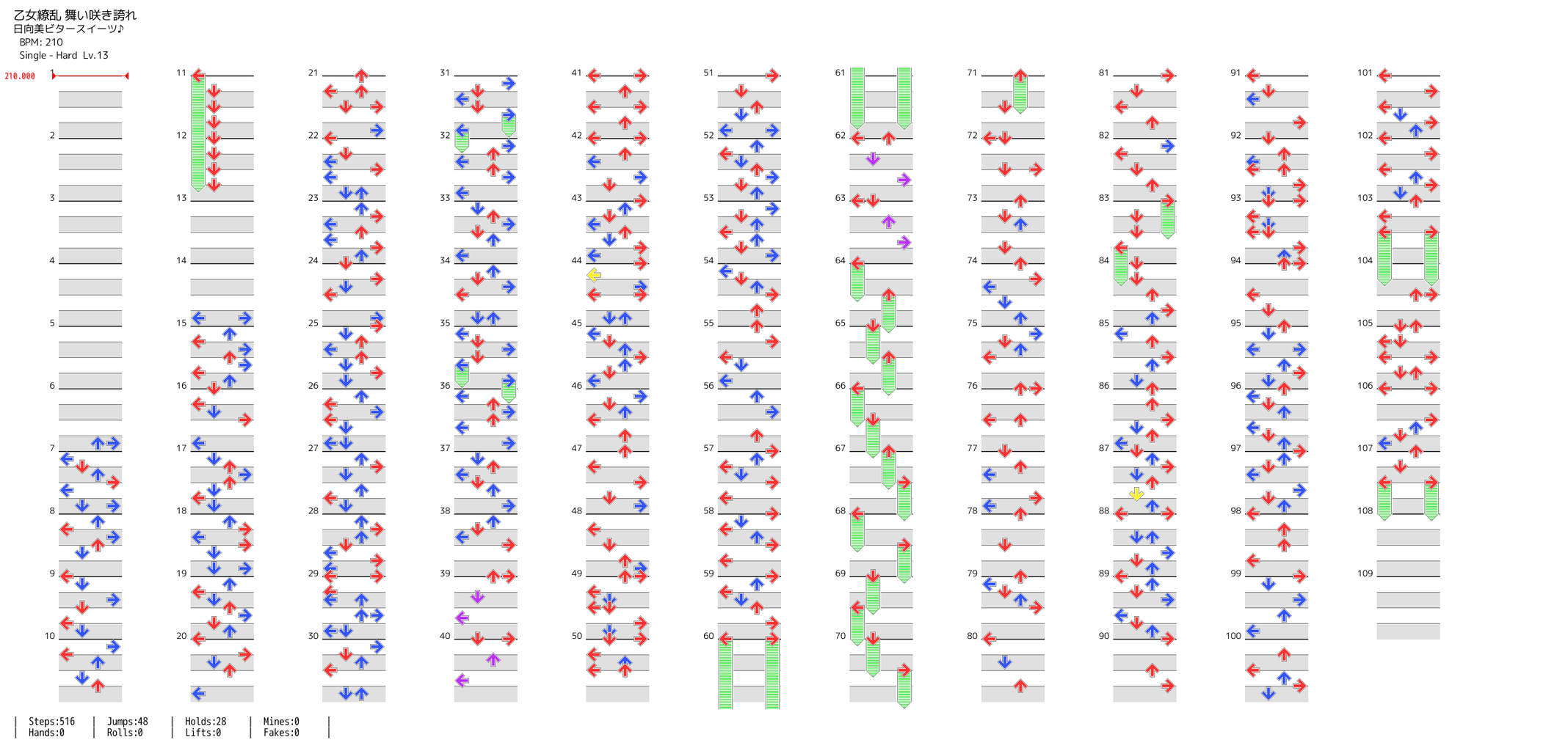 - 基本はBPM210の8分滝だが単→同時の配置もあり思ったより忙しい。捻りは序盤にしか出てこないが問題は中盤と終盤の交互難地帯で、一歩目を逆足で入ればアフロ踏みを駆使して交互に踏めるがかなり難しくスライド推奨。 (2015-03-14 22:07:51)