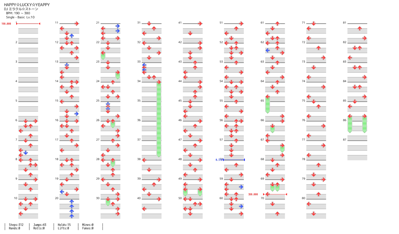 同時が多めであるものの全体的には4分配置が中心であるため、譜面自体の難易度は足10にも満たず、ハイスピ制限を考慮しても弱め(クリア挑戦〜適正レベルの場合はむしろ最後の高速に追いつけるよう対策する方が良い)。ただし接続やPFC以上は裏拍で始まる縦連のせいで難しめ。しっかり引きつけて踏もう (2021-12-21 18:06:38)
