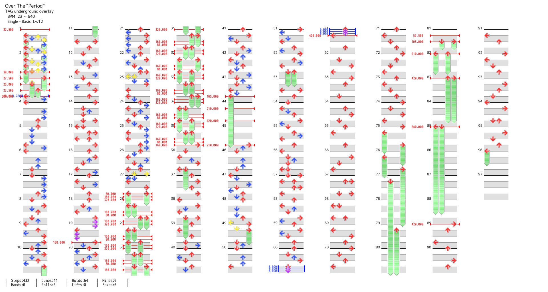 - 最後のBPM840地帯終了直後のノートは、BPM420の4分で「→・↑」