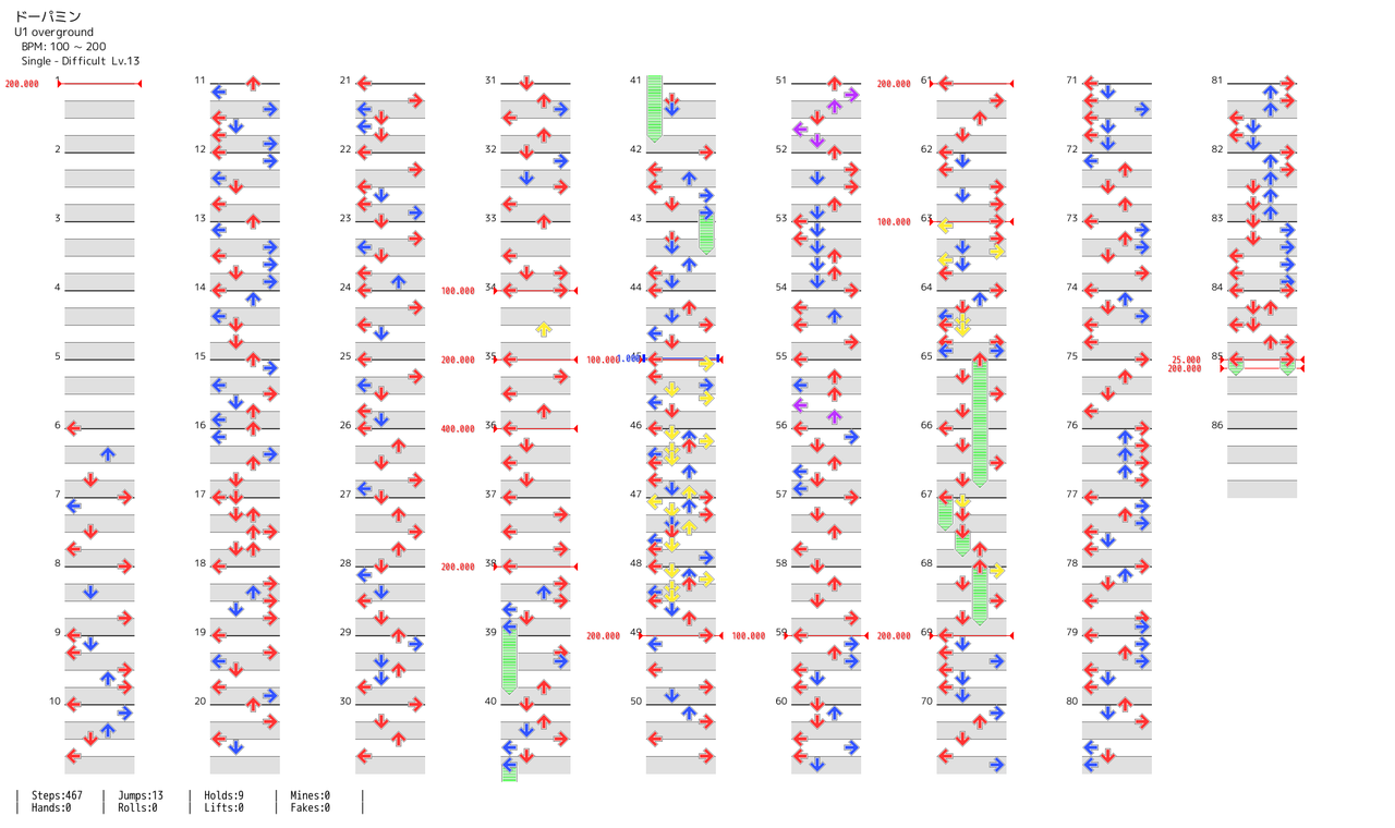 BPMが速くノーツ数こそちょっと多いものの、捻りはほとんどなく長い8分滝や交互不能箇所も最後のみだが、中盤に6分踏みが2回来るのでリズムを崩されないよう注意。ソフランが難しいがそれを含めても13では弱い方だと思われる。400地帯は4分(BPM200の8分)で「←↓←↓←→←→/←」 (2015-10-28 22:44:04)