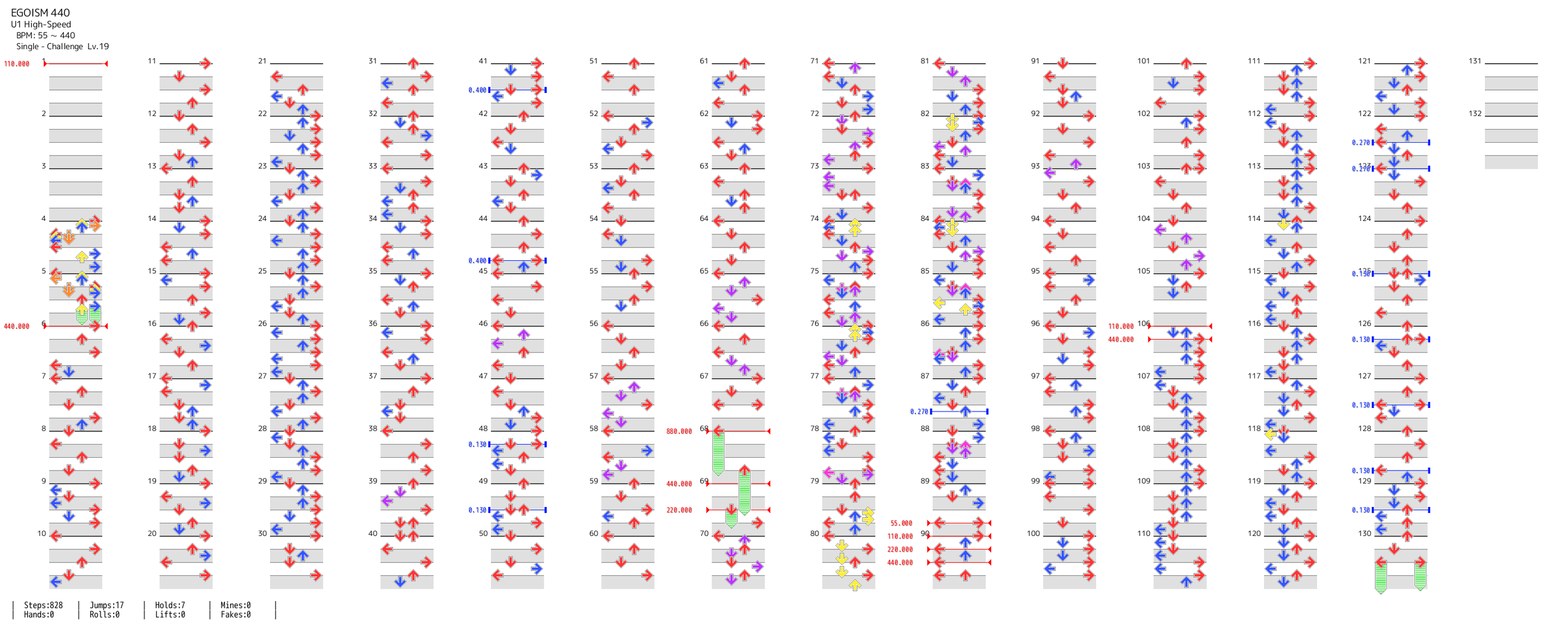 - ノート数811はElemental Creation(鬼)の860には及ばないが、EGOISM 440の方が30秒ほど演奏時間が短いので譜面密度は比較にならない。譜面密度は史上最大級と言える。 (2015-09-23 14:55:51)