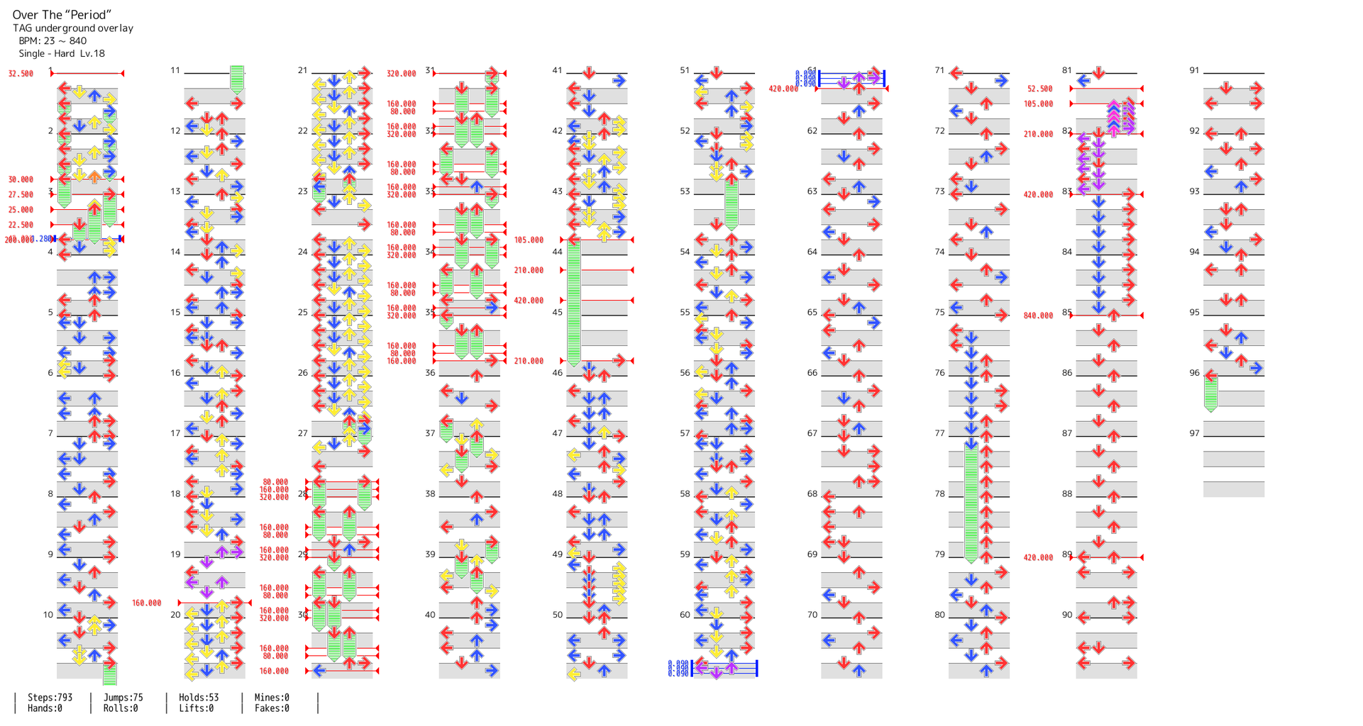 - 最後のBPM840地帯終了直後のノートは、BPM420の4分で「←↑・←→」。