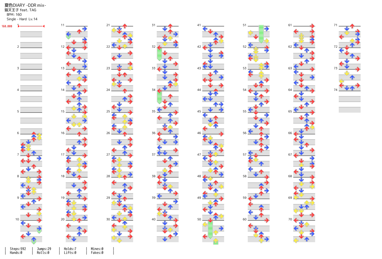 高スコア&フルコン狙いだと68~70小節目が鬼門。終盤なのでそこまでに全力投球していると思わぬリズム難で足下を掬われるので要注意。捻り耐性とペース配分スキルがあればクリア面ではそこまで強くない。 (2020-03-30 23:17:03)