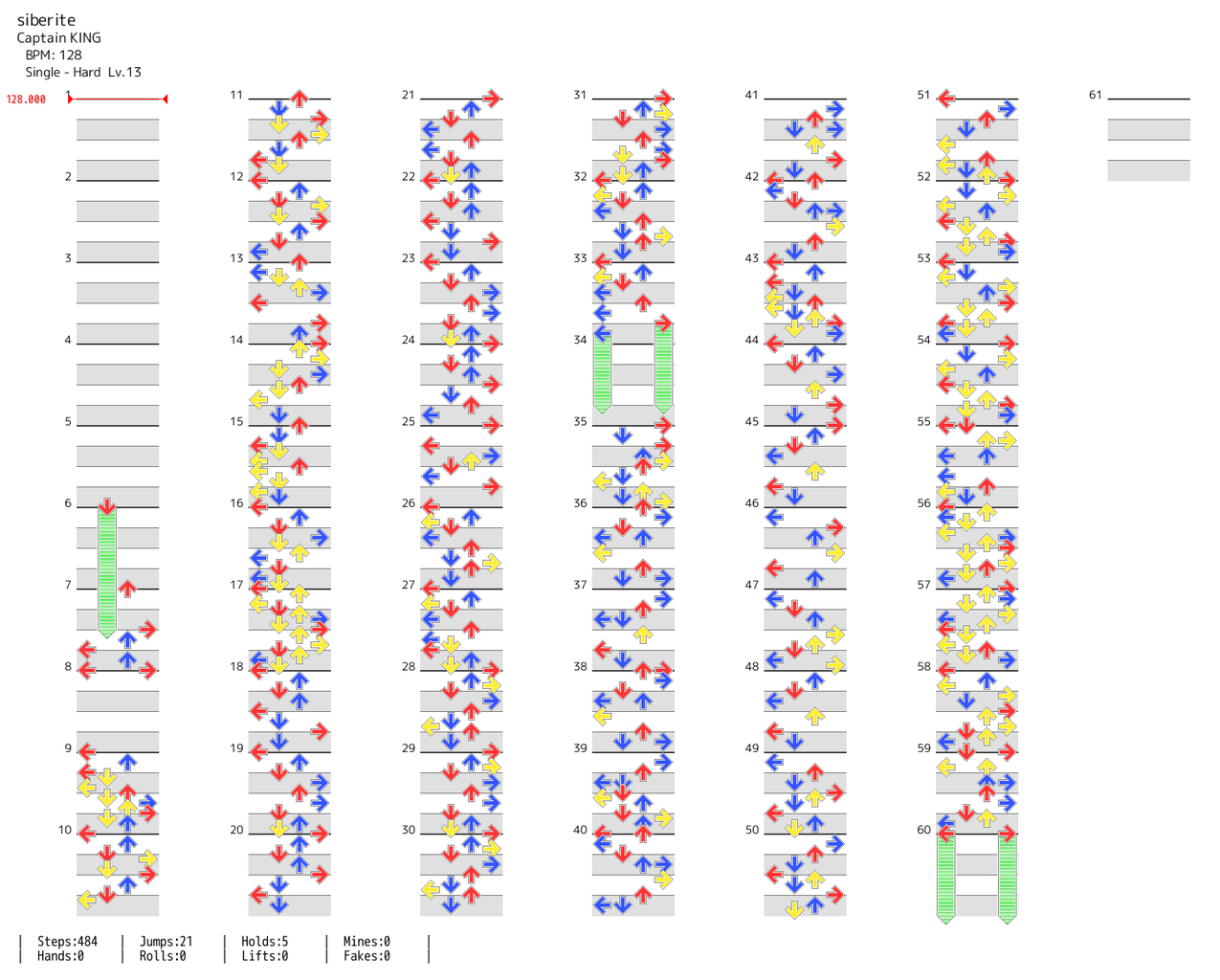 密度が濃いのもそうだが、至るところに銀パネをまたぐ配置が散りばめられているのがこの譜面の最大の特徴で、見た目以上に体力を使う。ここまで縦ビジ超特化な譜面は足13どころか上位の譜面でも珍しい。爪先やかかとでしっかりパネルを反応させる地力が必要で、MIRROR有無で踏み心地がだいぶ変わるので両方試してみるのが良い。 (2022-01-15 19:23:13)