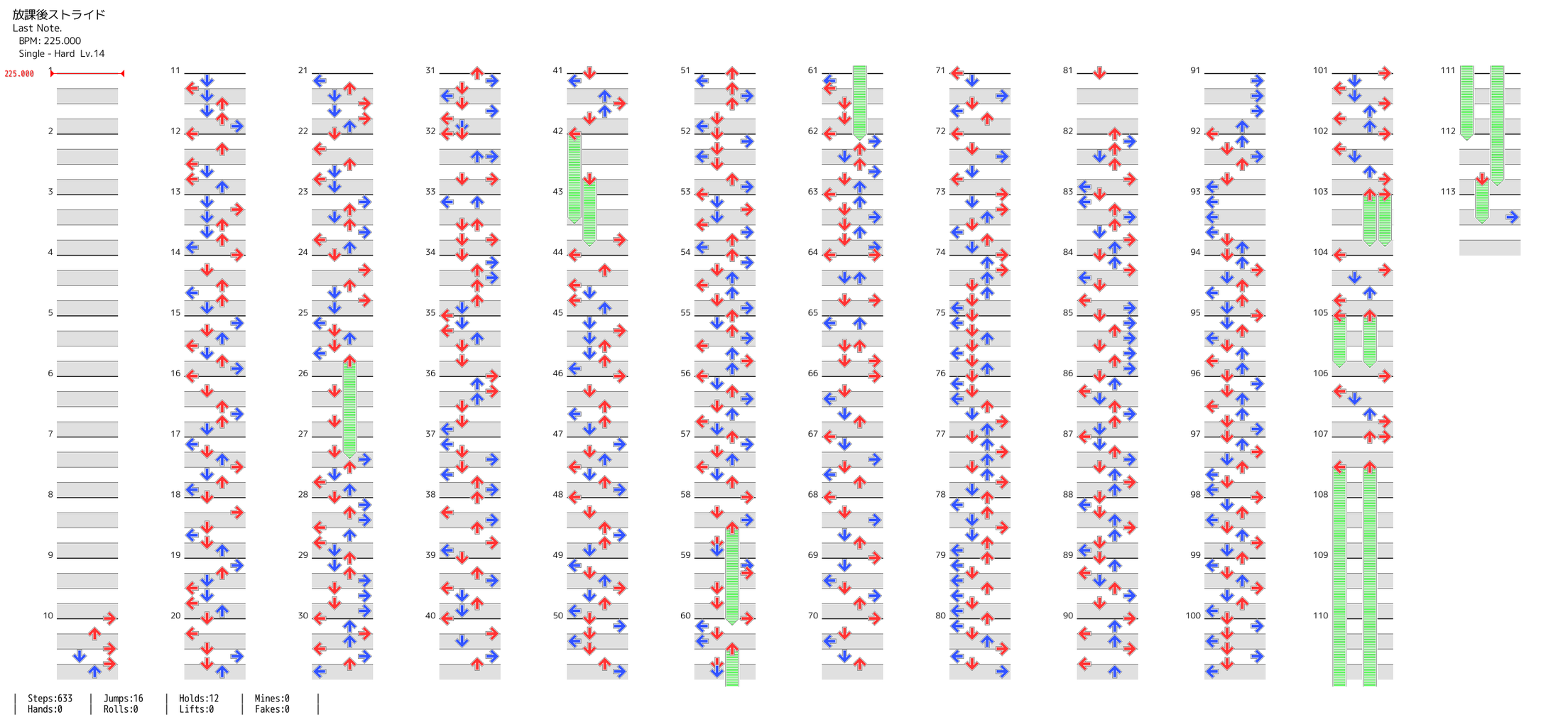 - ひたすら捻りを含んだ8分踏み、8分滝を踏まされる。付点8分こそないものの、気を抜くと容易には交互に踏めない配置が振ってくる。