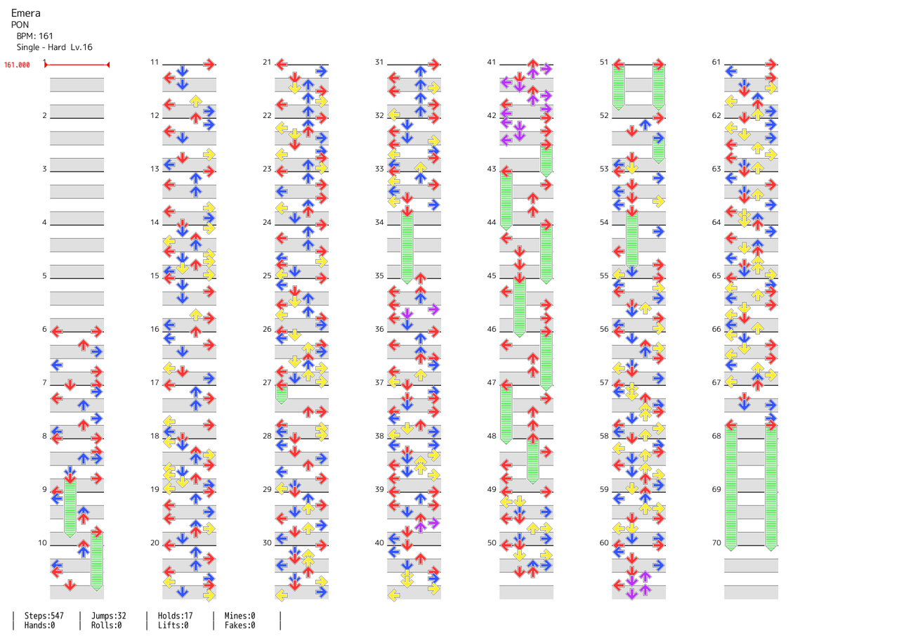 アフロ踏みが乱打中に混じって出てくるばかりか、真横までの捻り(→↑←"→" 系)も頻出する。 とくに前半はこの捻りが認識・反応できないと譜面の流れから脱線してしまう。 (2022-05-12 21:38:49)