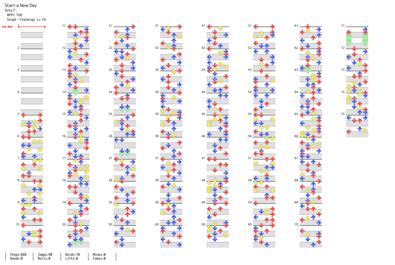 - 入り足を間違えると16分でスライドしたりする羽目になるが、逆足などを使って交互踏みするところに乱打が混ざる譜面。 (2017-06-01 23:04:47)