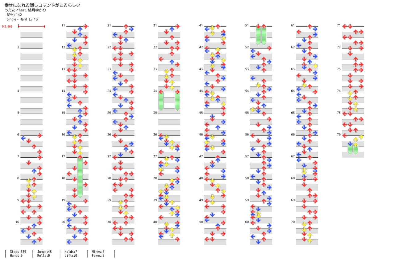 - 歌詞がコマンドになっているところはコマンド通りの矢印を踏ませてくるが、激では間に8分が入る、コマンドと別の矢印との同時踏みなど、ノートが追加されている。 (2017-08-13 00:21:01)