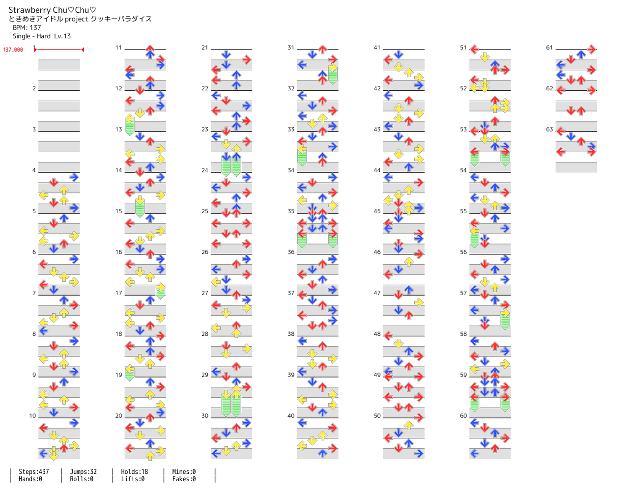 13弱クラスではあるが譜面が16分(黄色色)が大多数と少々複雑である。略リズム通りなのでしっかり把握すれば大きな難にはならない。 (2022-07-27 16:10:10)