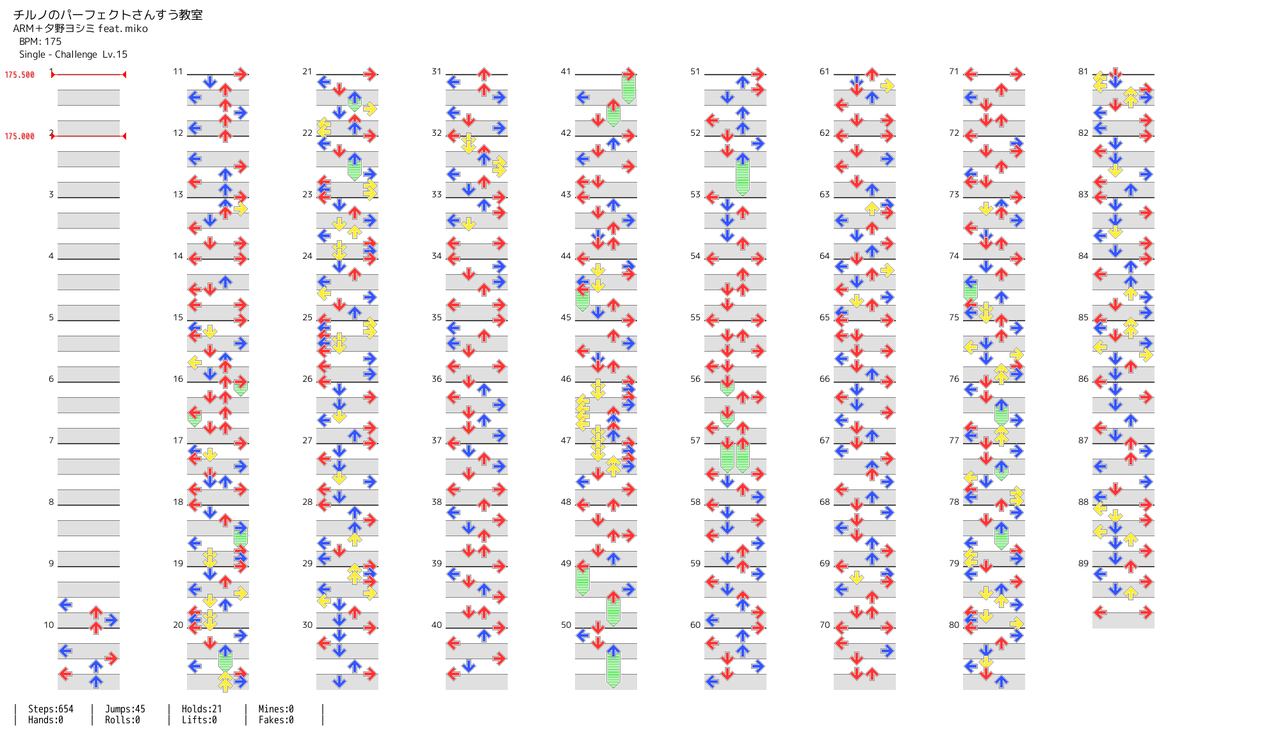 中盤の25連がちょっときついが全体的に配置がシンプルで踏みやすい。キャラを汲んでるっぽい譜面で楽しいな。 (2018-06-08 10:26:15)