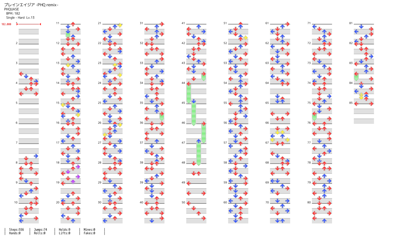 明確な休憩は中盤のフリーズアロー部分のみであとは同時付きの8分を踏まされ続ける体力譜面。8分をスライドで捌くと適正者は体力切れを起こしかねないので出来れば捻って交互に対応出来るようにしたい。ノンバーも結構キツかった。 (2020-12-02 00:28:53)