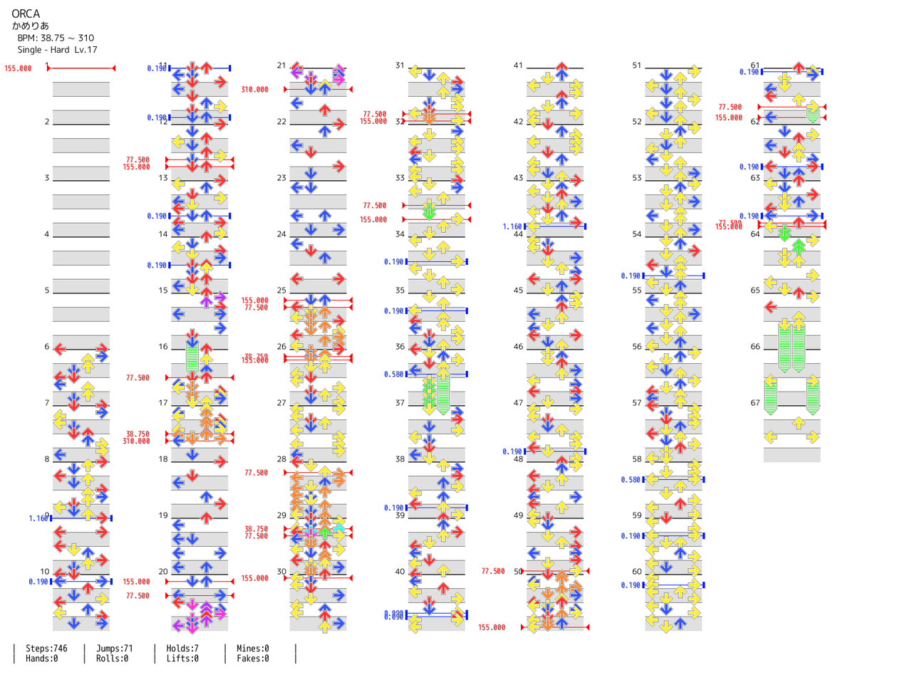 - とにかく停止とソフランが多い。また、曲の中盤からラスト付近まで表拍が黄色(NOTE時)矢印になる。そのためCHAOS値がACE FOR ACES(鬼)に次いで全曲中3番目とかなり高い。