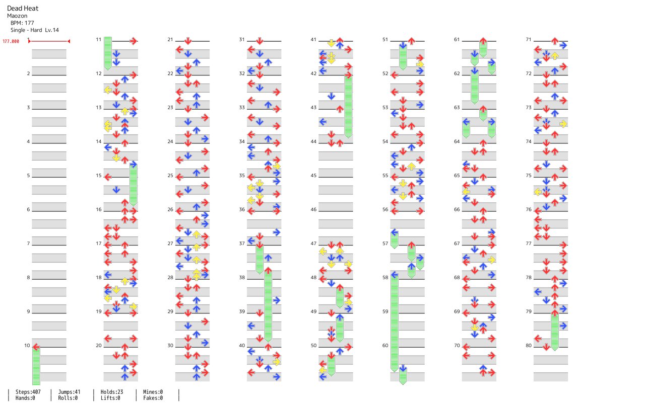 最近の譜面にしては珍しくノート数がかなり少ない(足14では下から数えて4番目)。ノート数が少ない譜面は尖ったものが多いがこちらは至って普通の譜面。 (2019-04-08 21:52:08)