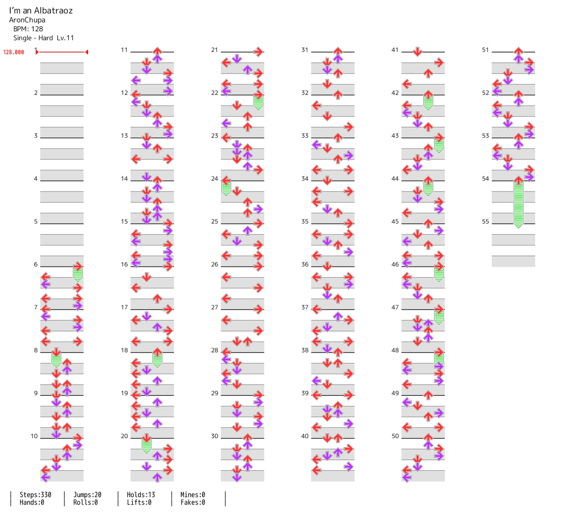 - 全体を通して12分主体のスキップ譜面。スキップ譜面の中でもかなりBPMが低いほうなので、勢い余って早めに踏まないよう注意。