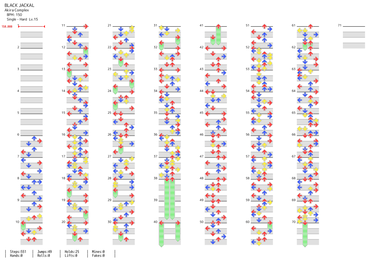 BPMが遅めな代わりに捻り・同時で締める滝・片足いじめなど多彩な配置で攻めてくる譜面。リズム難ぽいところはほぼ曲合わせなのでよく聞いて踏もう。 (2019-09-17 11:09:44)