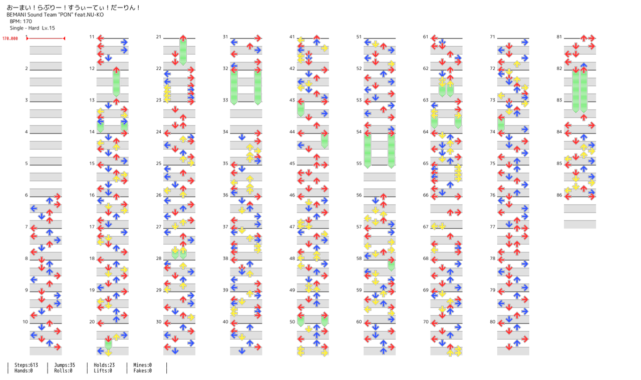 地力譜面。連続アフロがあることを除けば素直な配置しかないのでスコアは下手な14より出しやすい。ただ物量はレベル相応で16分も結構多く配置されてるので、クリアに関してはLv15入門~下位ぐらいに収まるか。 (2019-09-17 02:34:21)