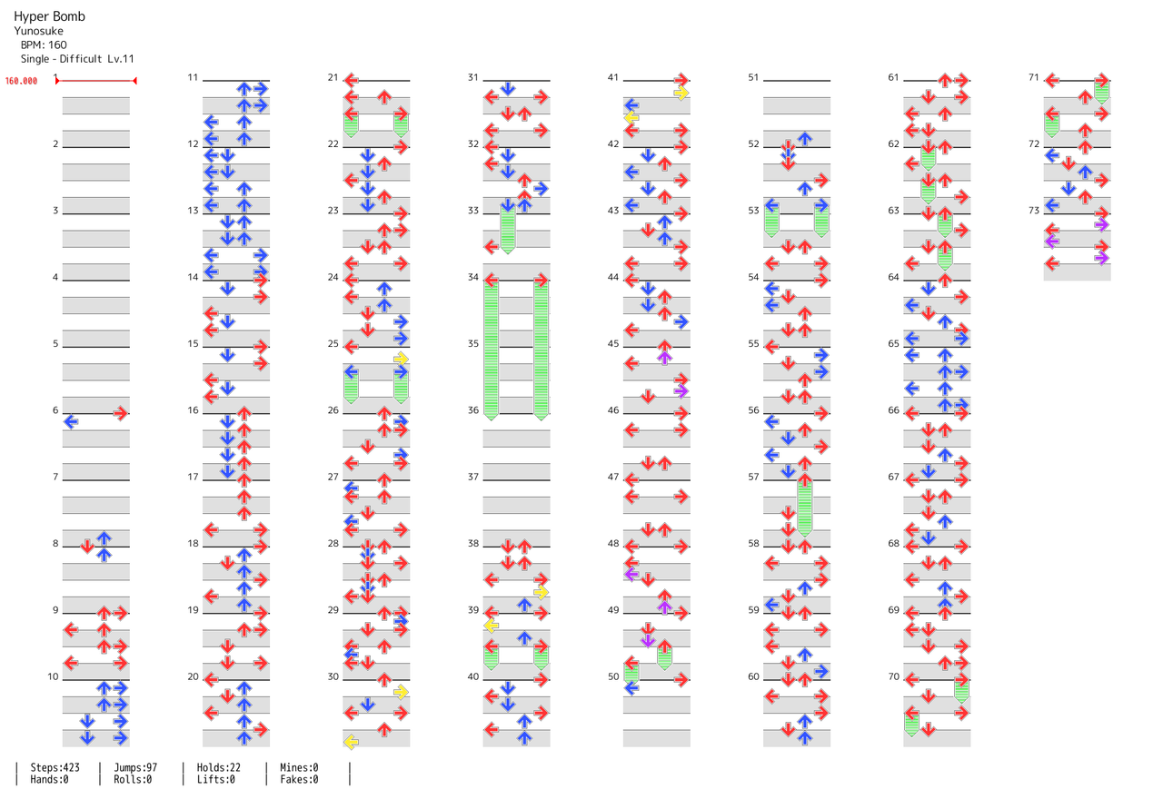 前半に同単同ラッシュがあり、後半は8分踏みの締めが同時踏みのパターンが頻出するので、この手の同時が苦手だと辛い (2020-07-06 21:16:02)