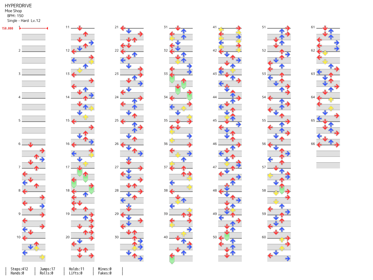 8分捻り、若干のリズム難、正面向きで16分が混ざった長い8分、そして捻り…と一定間隔ごとに傾向が切り替わる譜面。休憩がほぼないので体力も必要 (2020-08-03 22:14:58)