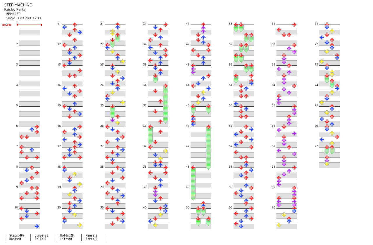 DSPでもリズム難は健在、加えて折り返しビジ、上軸多めの八分滝、視認性を下げてくるフリーズ絡みの滝、回転配置、とどめに12分縦連打ラッシュとこれでもかとばかりに様々な要素が詰め込まれており実質足12と思って挑んだ方がよい。リズム難で力みすぎると後半持たなくなる可能性もある。 (2020-07-29 06:14:57)