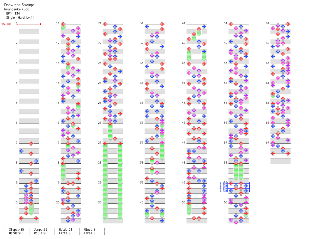 SWEET HOME PARTY(激)の前半をマイルドにしたような譜面で、序盤と終盤のサビは原則同じリズムの繰り返し。譜面画像の桃→紫→桃&その逆(実機NOTEだと全て緑のところ)は8分のリズムであることを把握するとやりやすくなるかも。終盤は密度が更に高くなり、停止以降は同時も絡むせいで認識が非常に辛い。クリアは適度に誤魔化せば問題ないが、接続やスコア難易度はお察し。 (2020-11-23 17:06:07)