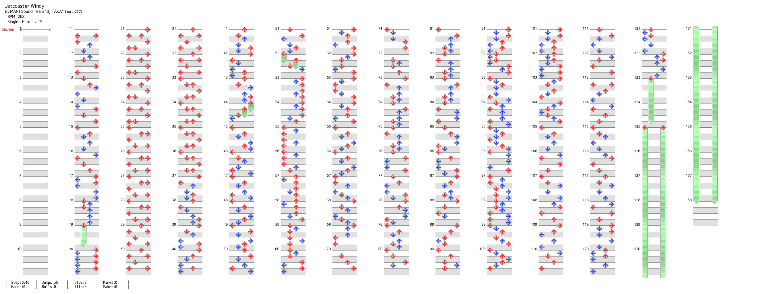 譜面傾向としては理系ポップのソフラン無し強化版といった内容で、歌詞合わせの裏拍リズムが目立つ。序盤の16小節にも及ぶ4分単同地帯は初見だと面食らうかも。それ以降も片足いじめや8分の入足が縦連となるような個人差が出やすい配置が続き、休憩もほとんどない。総合的には普通の足15。 (2020-10-11 20:10:55)