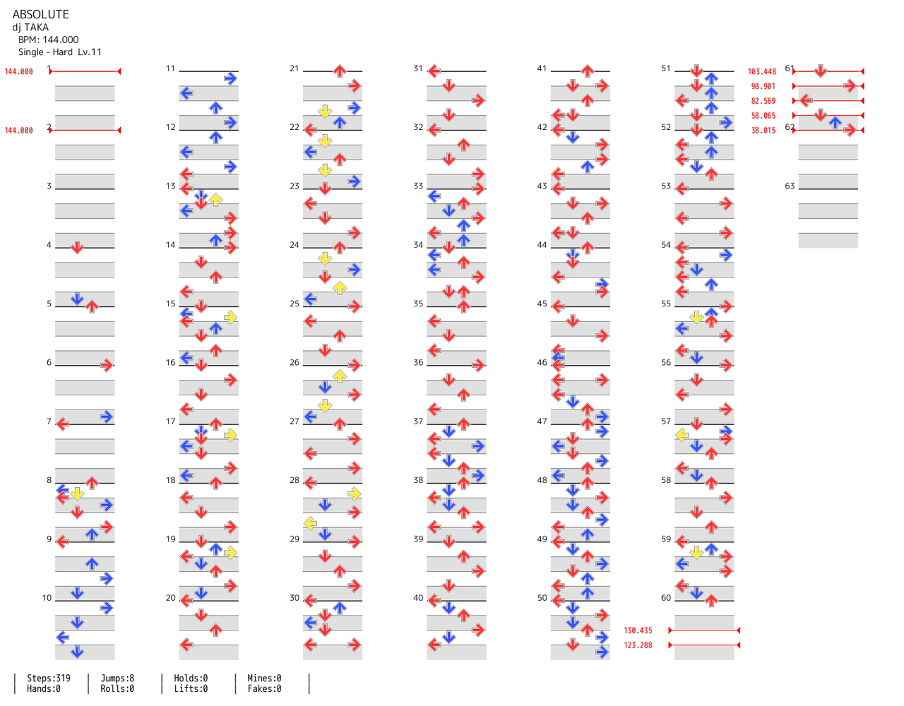 - 前半後半は音合わせの16分踏み、中盤は8分踏みの譜面。