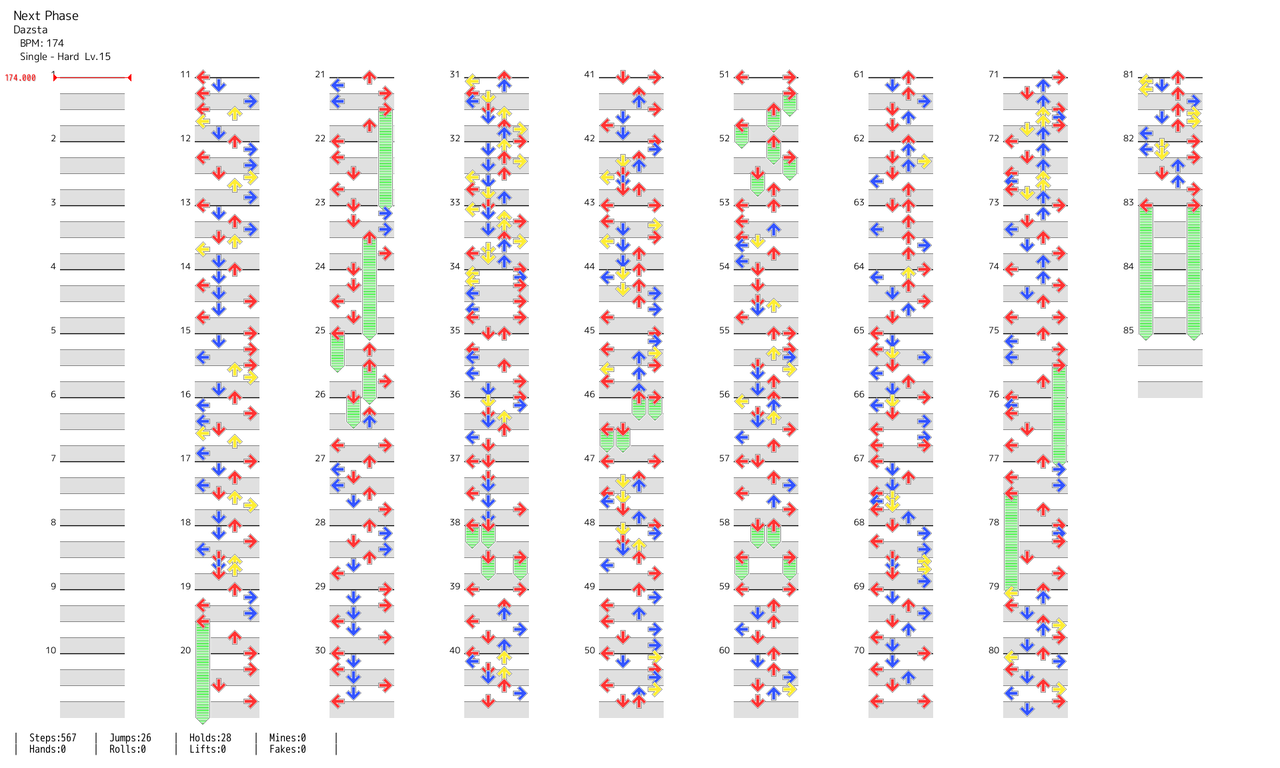最初を除けば16分の裏拍絡みは一切なく、付点8分のリズムすらない非常に素直な曲構成。配置に関しては微妙に遠いものの、中盤までは踏みやすい。終盤に16分ビジが3回出てくるが、直前の8分上軸5連から交互に踏める形となっている。ラストの往復ビジ含む16分5連×3地帯は半回転しない限り間の8分でスライド必須なため注意。 (2021-07-24 19:31:22)