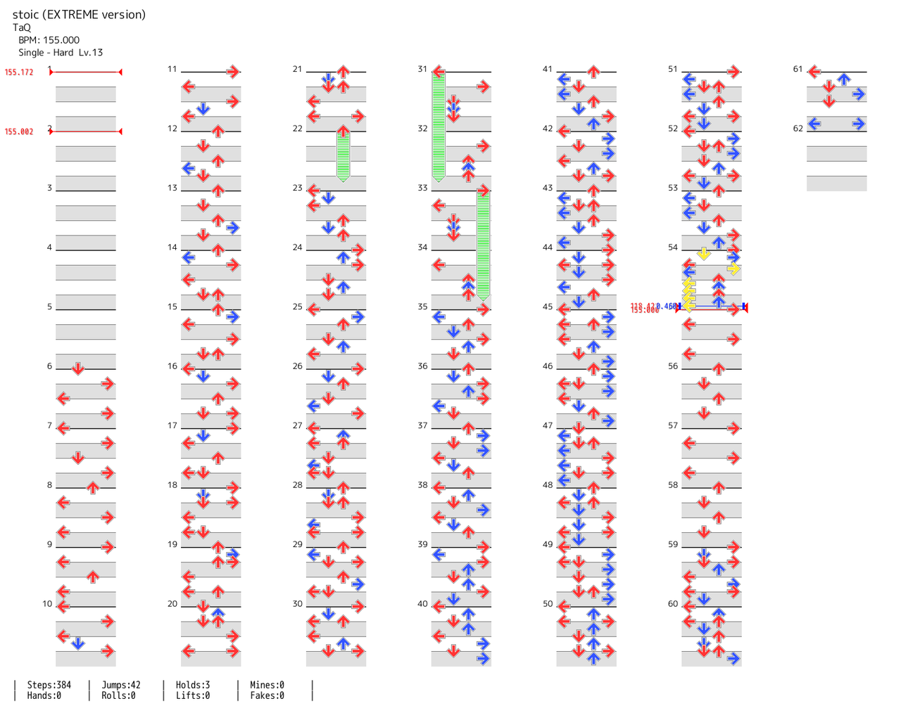 最初は簡単だが徐々に譜面が難化し、終盤は同時踏みの混ざった長い8分滝を踏まされる。