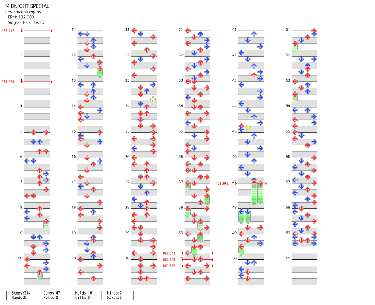 - BPM推移:182-183-185-187-182 2回目の「MIDNITE SPECIAL!!」の掛け声から速くなり↑→FAのとこで182に戻る。クリアには影響はないがスコアを詰めるなら覚えておこう。 -- 名無しさん (2022-06-13 20:26:47)