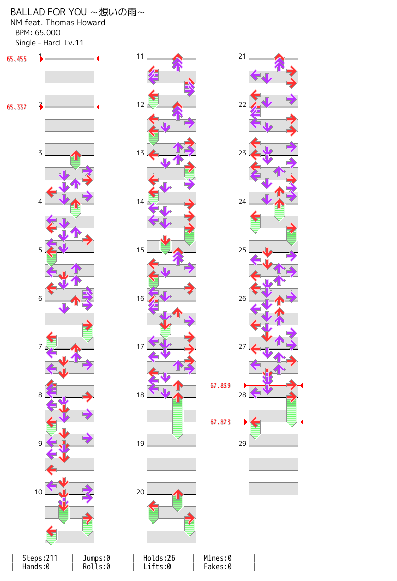 - 基本的に判定が遅めなので矢印を引きつけ気味に踏んでいくのだが、譜面画像の通りラスト5歩から謎の加速が入るのでMFC狙いの際はここだけ早め意識(特にラスト1歩は目押し推奨)なのを覚えておく必要がある。ハイスピを使ってBPM195の4分譜面と考えれば同時が無いため足8でもまだ逆詐称で、足6〜7ぐらいだろう。 -- 名無しさん (2023-06-18 14:17:26)
