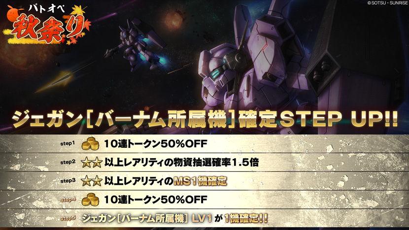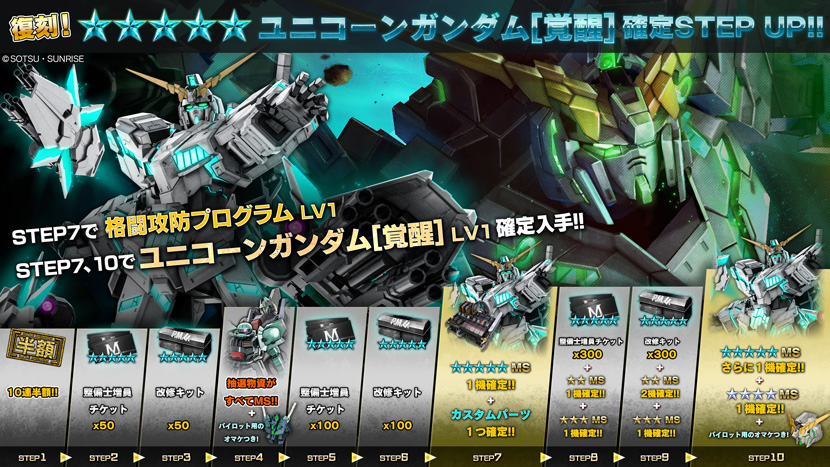 STEP3を要請すると、STEP UP抽選配給は終了となります。- STEP1(トークン15枚):COST750MSが1機確定!+10連半額